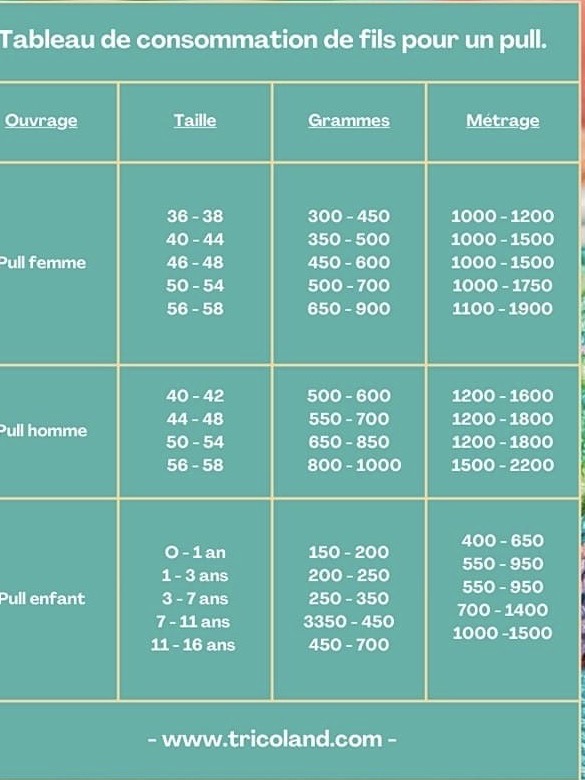 J'ai pris ce guide sur le site https://legarsquitricote.com C'est très bien fait. Comme il le dit, ce tableau est un guide. Selon votre tension, les chiffres peuvent varier. Je me réfère souvent à ce guide. J'adore.